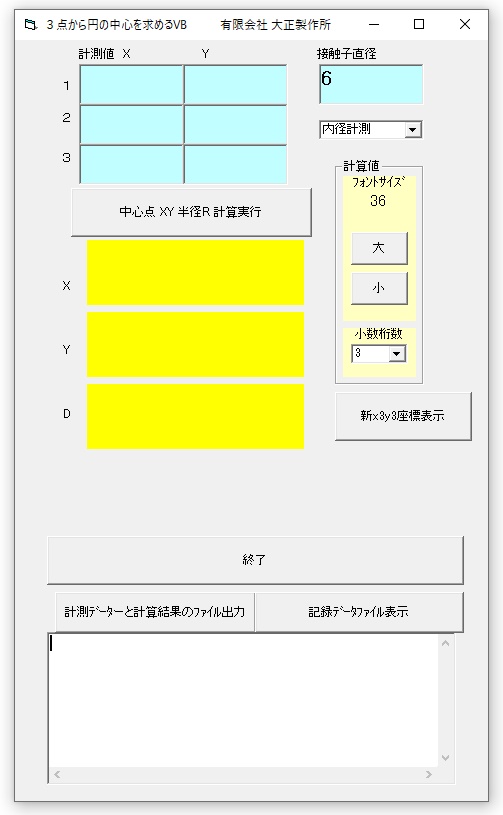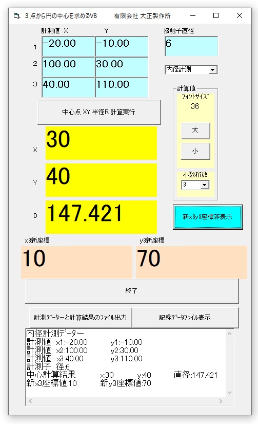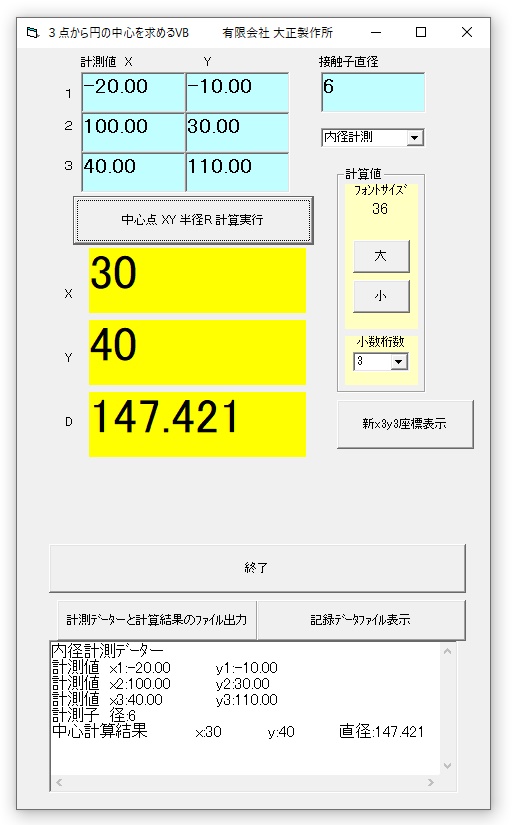 実行画面1で計測値x1y1、x2y2、x3y3すべての点を入力して[中心点XY半径R計算実行]ボタンをクリックすると図のように計算結果が表示されます。
