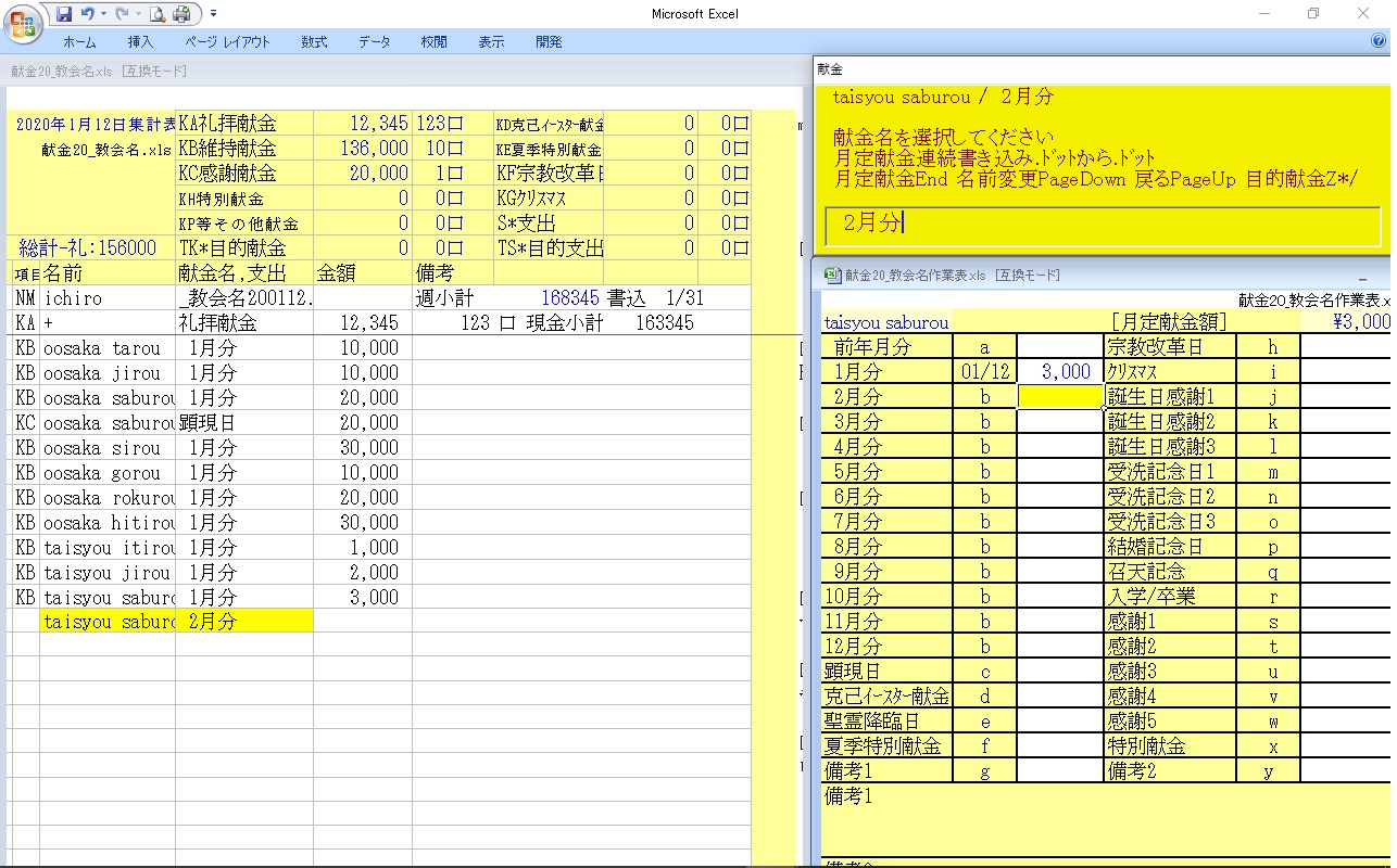 献金名選択では献金名の右側のアルファベットがショートカットキーです また名簿選択では上記のようにアルファベットでそこに飛びます